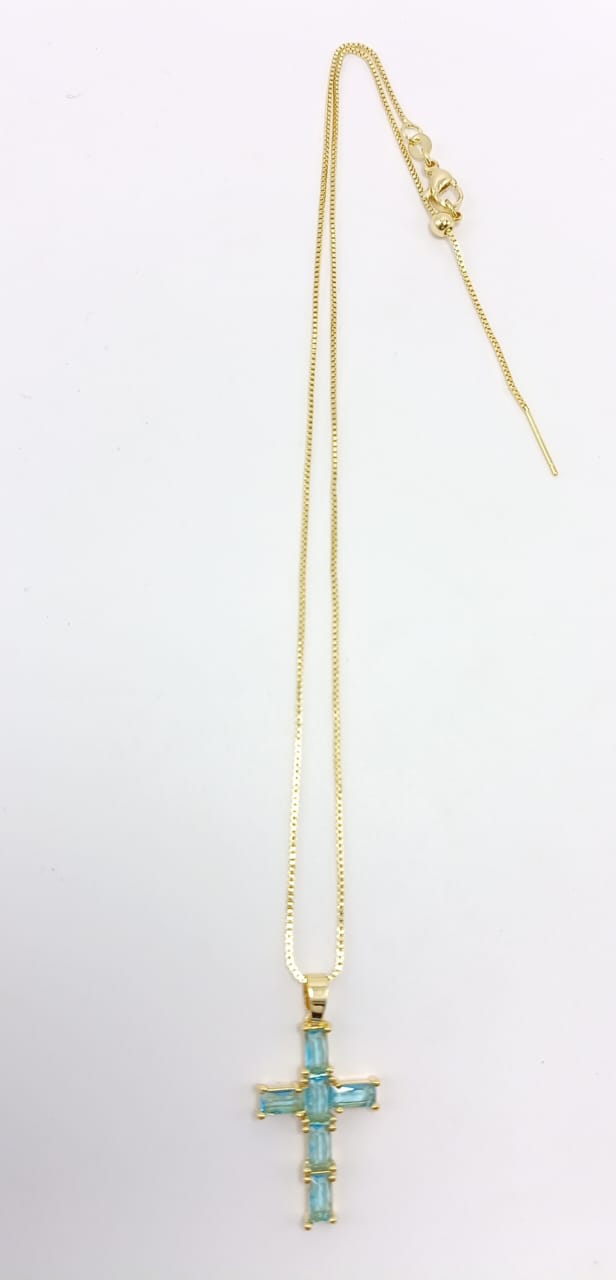 Cadena con dije rodio y circón cruz. AzuL Claro